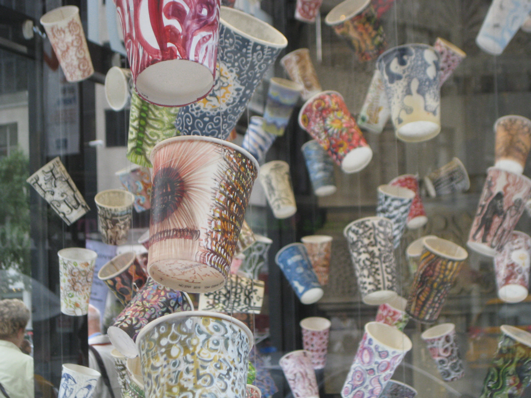 Gwyneth Leech, at far right, is creating coffee cup art in the Flatiron window gallery through the end of the